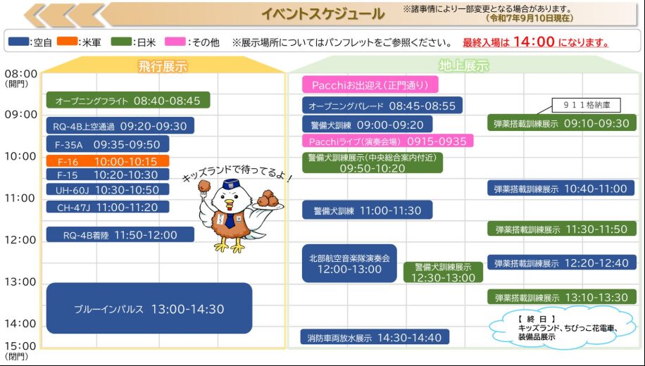 三沢基地航空祭スケジュールは今後変更される場合があります。最新情報については、イベントスケジュール(三沢基地公式ホームページ)にてご確認ください。