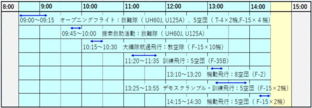 | 9:00-9:15 オープニングフライト | ・救難隊(UH60J/U125A) ・5空団(T-4×2,F-15×4) |